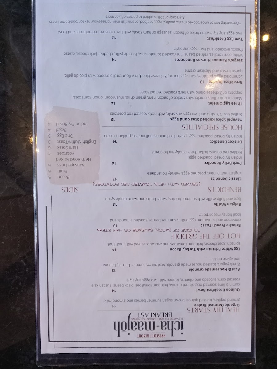 Overall, the Icha Maajoh Menu offers a diverse selection of meals that cater to every taste, from health-conscious choices to rich, indulgent dishes. Whether you're enjoying a leisurely breakfast or grabbing a quick bite, there's something for everyone at this Prescott gem.